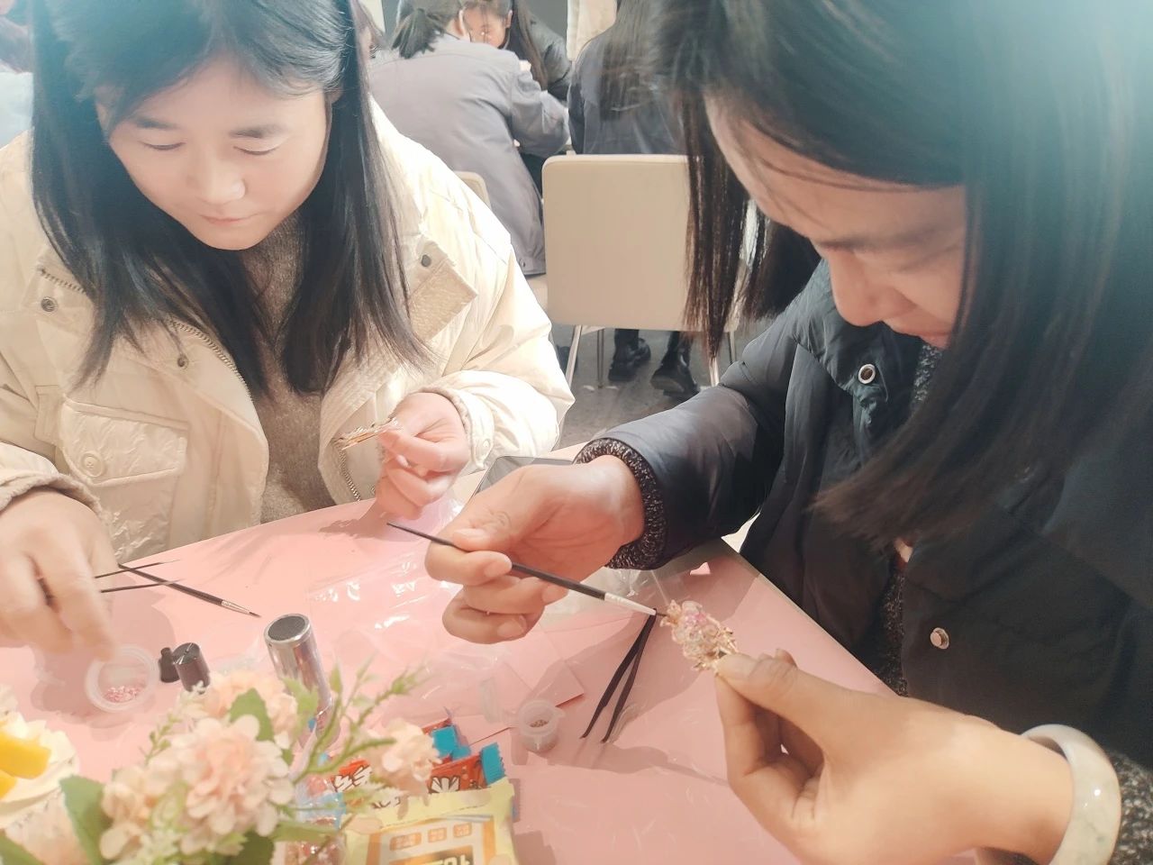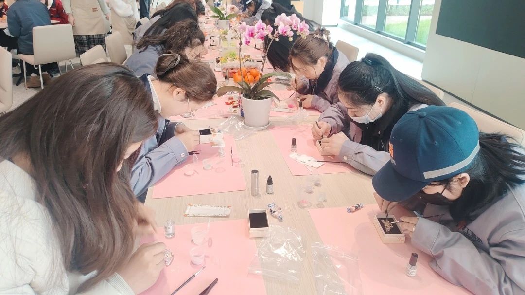 與此同時,常熟分公司的非遺螺鈿胸針制作活動,將傳統(tǒng)技藝融入現(xiàn)代職場。螺鈿工藝傳承人現(xiàn)場講解千年技藝的歷史與精髓,女員工們化身“巧手匠人”,在貝母的流光中雕琢匠心:挑選螺片、設計紋樣、鑲嵌打磨……方寸之間,花鳥紋樣盡顯江南雅韻,幾何構(gòu)圖呼應現(xiàn)代審美。活動不僅讓員工體驗了非遺文化的魅力,更讓她們感受到公司對女性精神生活的重視。